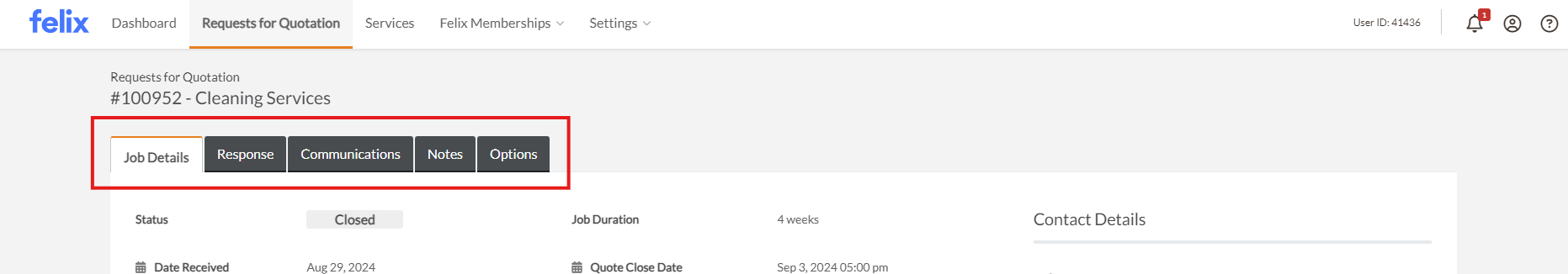 | Job Details | The Job Details tab contains basic information about the overall job. This section displays important information such as the status of the RFQ, the quote close date, location and contact details as well as a list of the services you matched with on this RFQ. You can read more about the Job Details section of an RFQ by reading our guide; Understanding job details. |