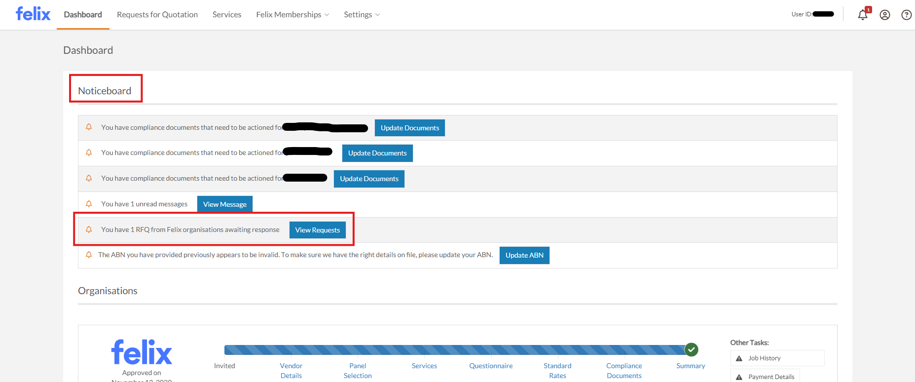 On your Felix dashboard, you are informed about key actions required. One of these includes receipt of an RFQ, but you also will see notifications related to RFQs for: